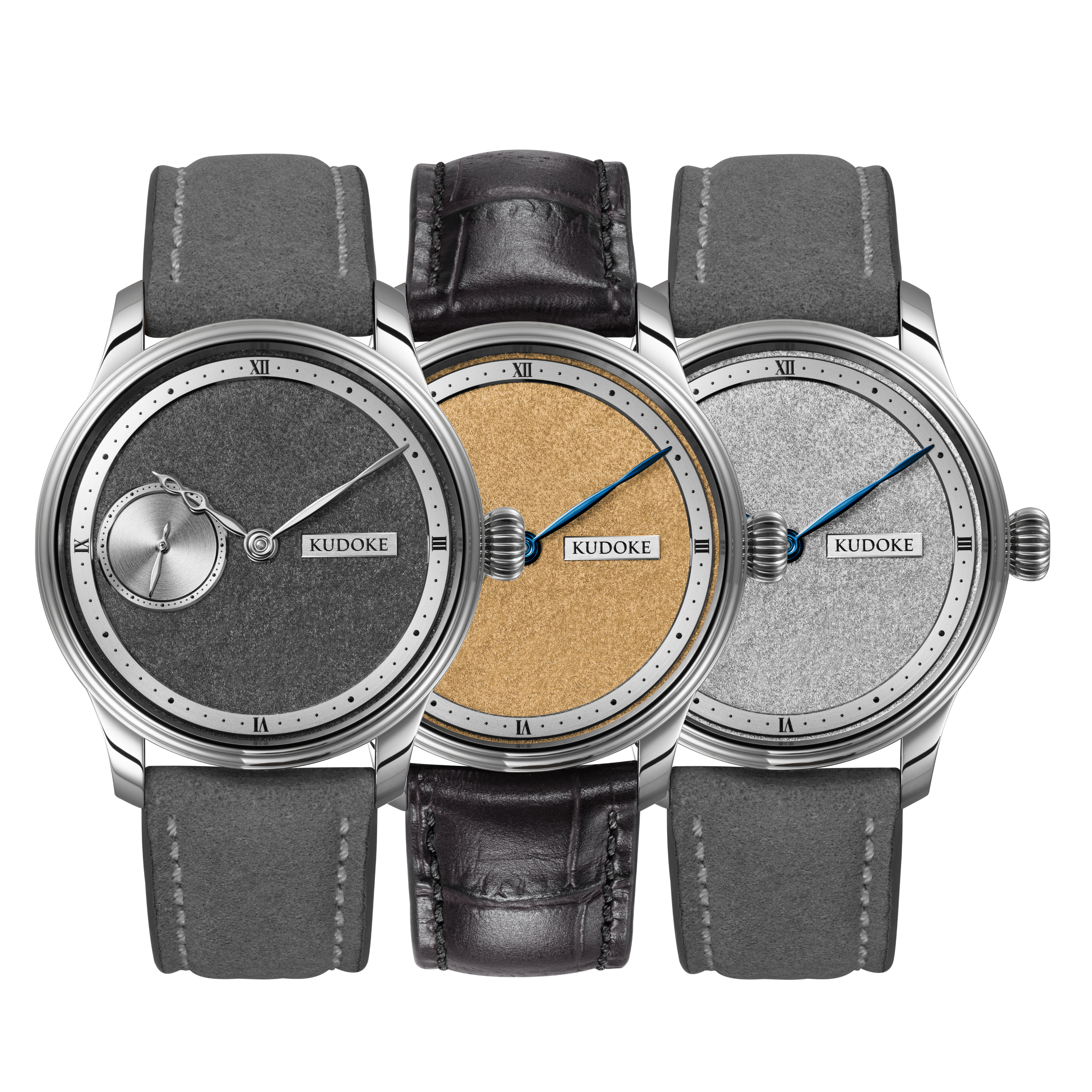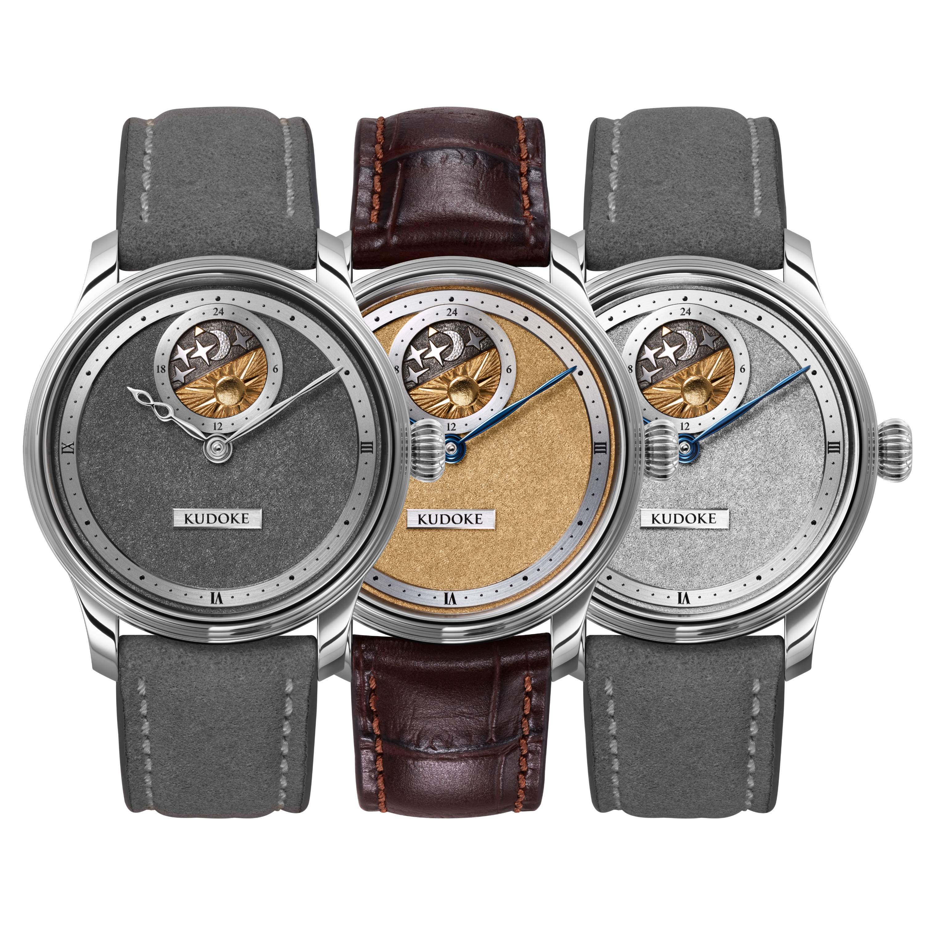Die neuen Tremblage-Zifferblätter sind in drei galvanischen Farbvarianten erhältlich: Gelbgold, Schwarzrhodium und Weißrhodium – jeweils fein abgestimmt auf die Gestaltung der Modelle, insbesondere auf die Tag-/Nachtscheibe der KUDOKE 2.