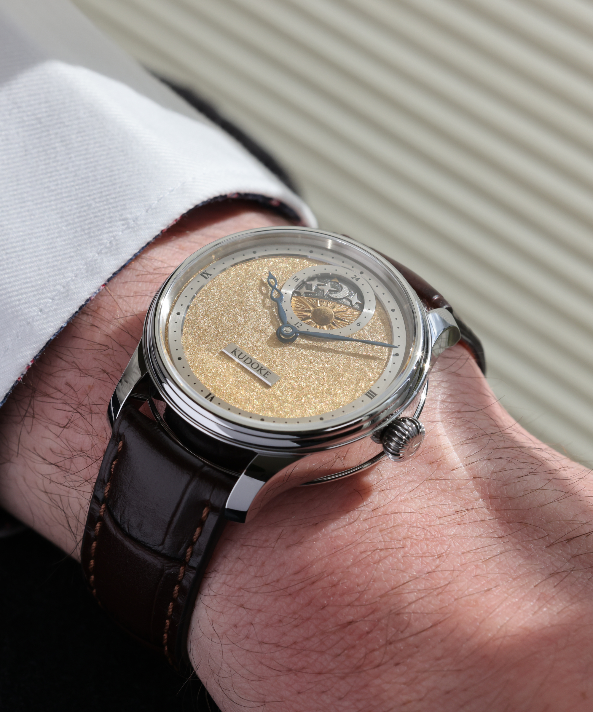 KUDOKE 2 interpretiert die Tremblage-Technik im Dialog mit ihrer ikonischen Tag-/Nacht-Anzeige bei 12 Uhr.