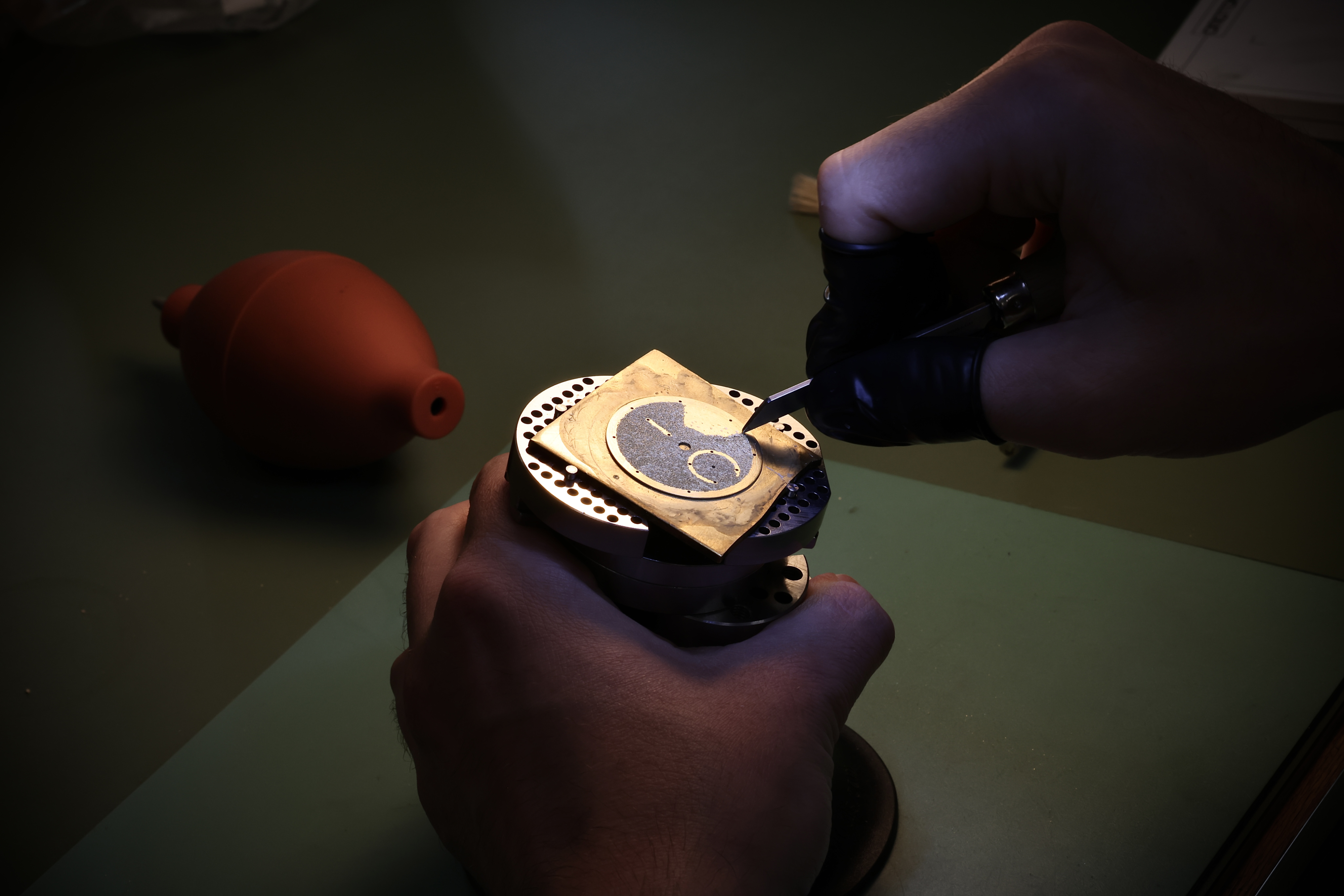 Bei KUDOKE erfolgt diese aufwendige Bearbeitung vollständig inhouse – vom ersten Ansatz des Stichels bis zur finalen Oberfläche inklusive der galvanischen Behandlung. So bleibt jeder Schritt in der Hand der Manufaktur und jedes Zifferblatt Ausdruck eigener handwerklicher Handschrift.