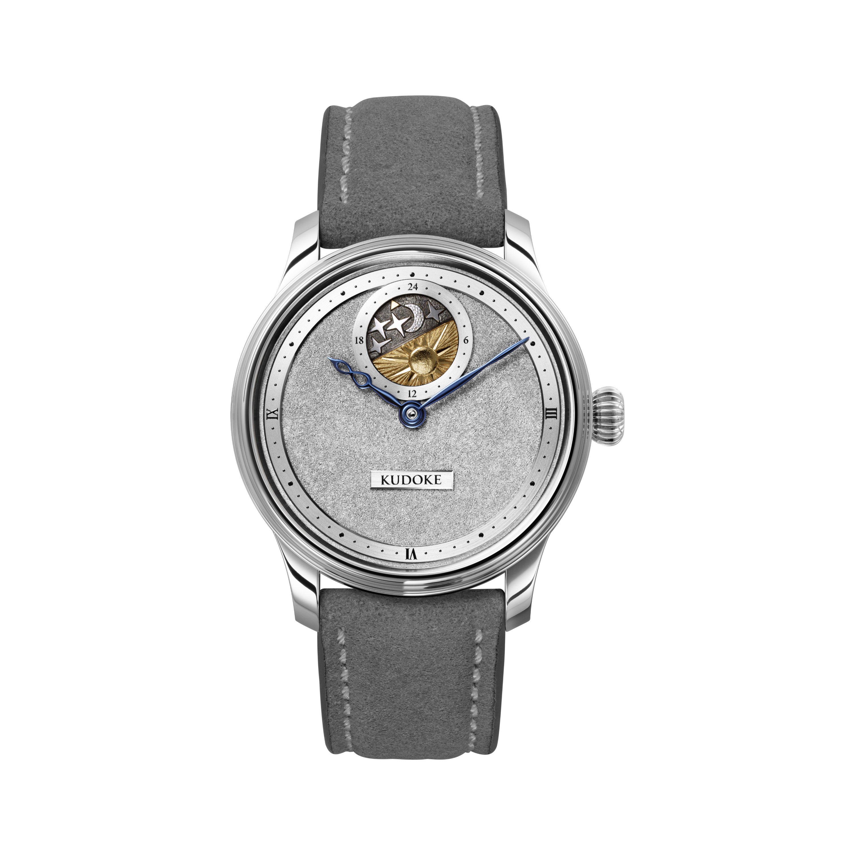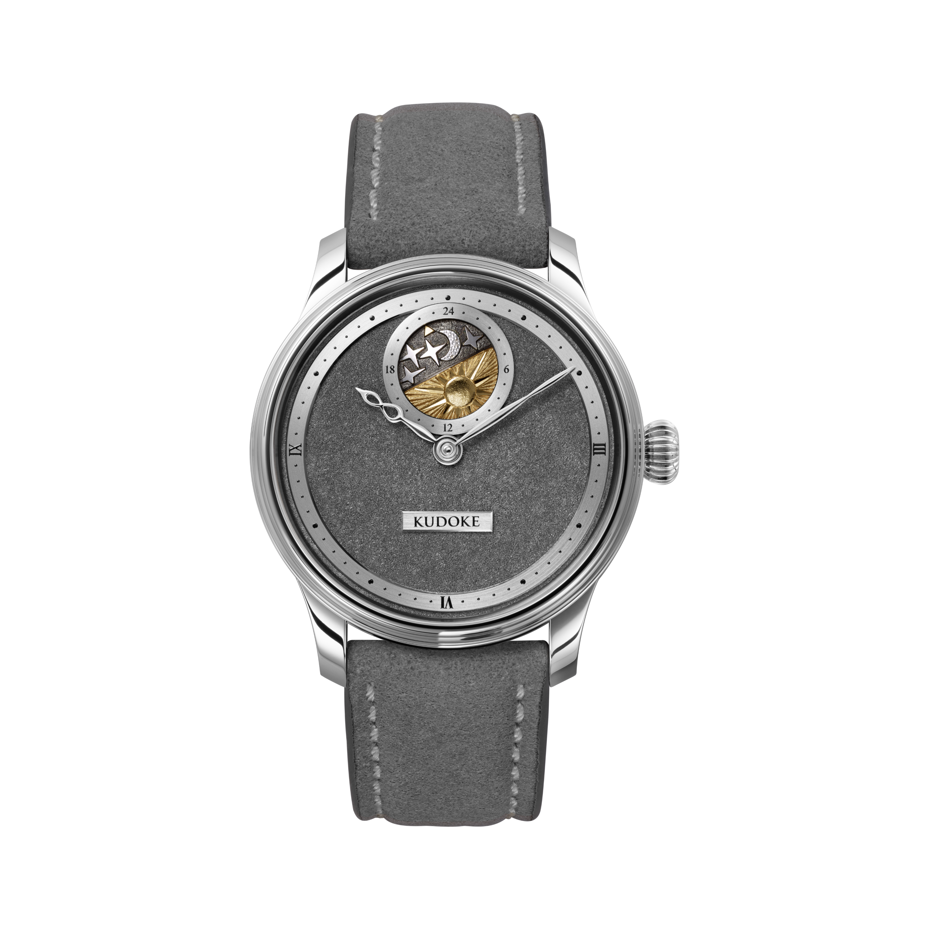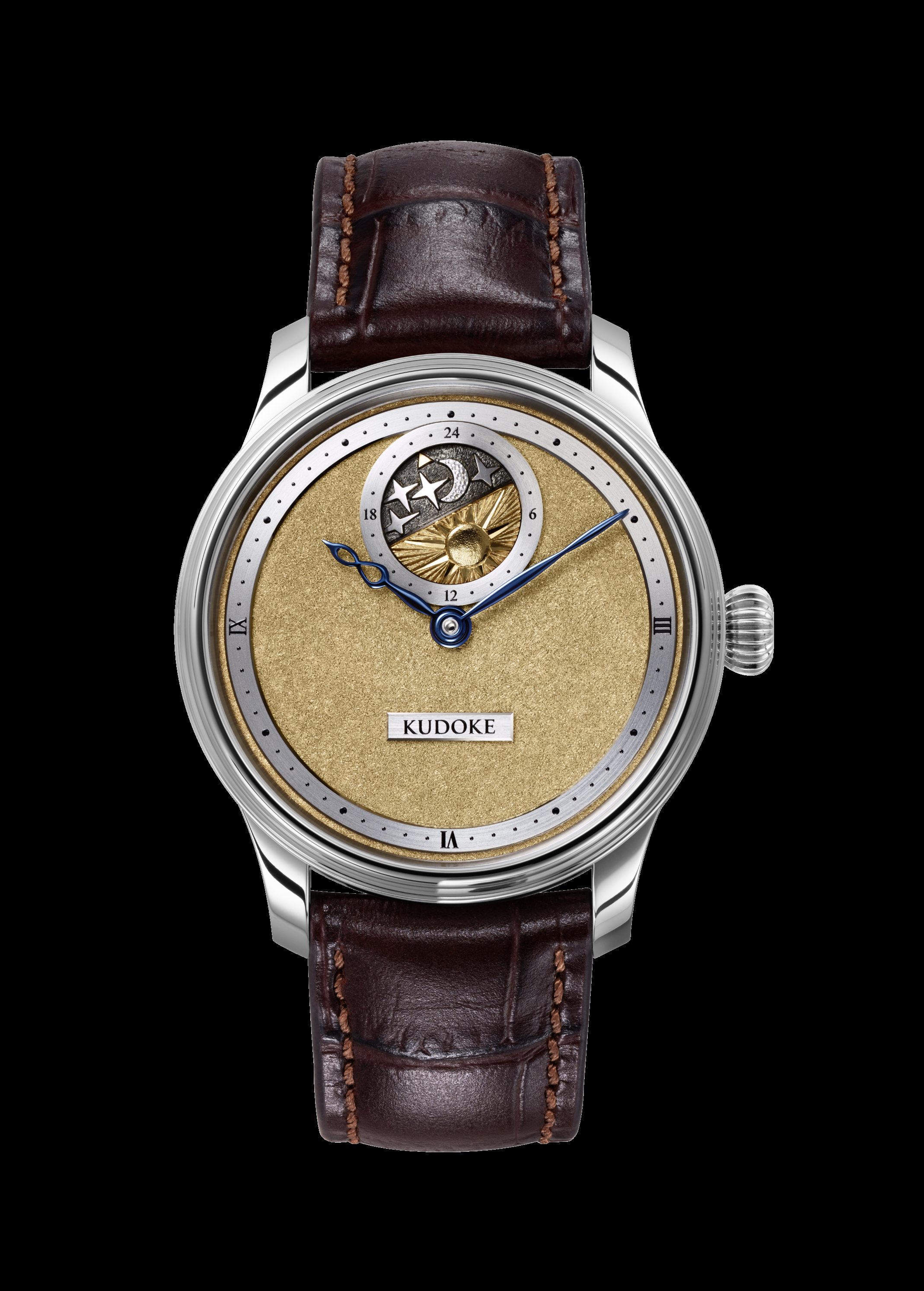 Der Blick fällt sofort auf die sich drehende, gewölbte Himmelsscheibe – handgraviert und galvanisch dreifarbig behandelt zeigt ein kleines vergoldetes Dreieck auf sehr ästhetische Weise die Stunde des Tages oder der Nacht an.