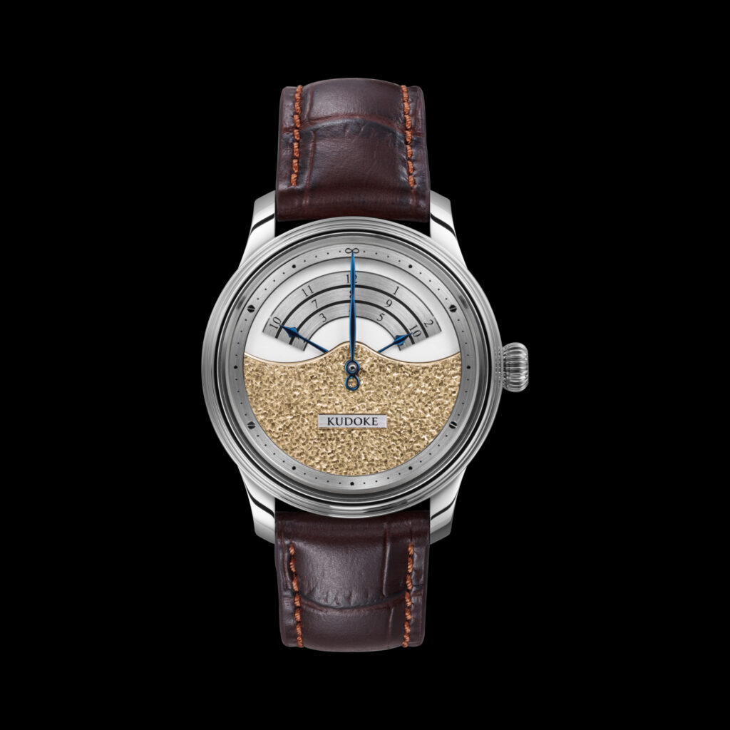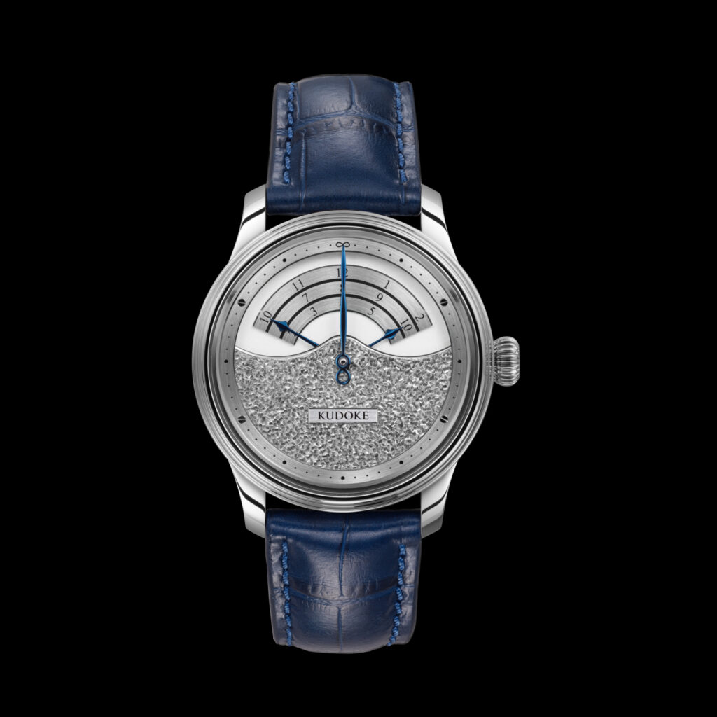 While the minutes are “classically” indicated by the large blued steel hand on the dial chapter ring sitting at the top, the hour indication is placed on an attached plate divided into three sections on the dial level below.
